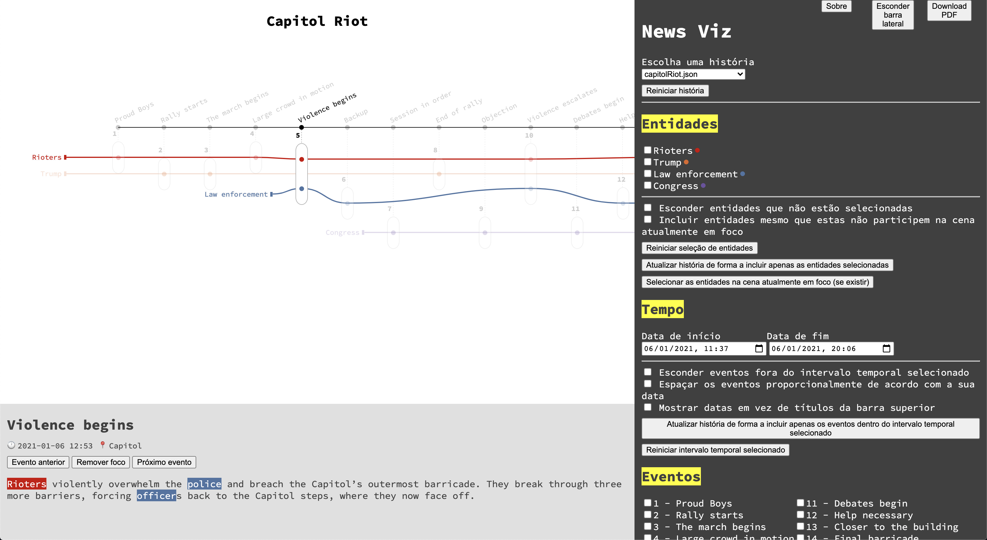 NewsLines is a prototype based on the D3 Narrative Layout framework which aims to help create storyline visualizations (similar to xkcd's Movie Narrative Charts). With this project, we wanted to explore the use of this type of visualizations in the journalistic domain, having as input news stories. The prototype was developed in the context of my Master's thesis, titled "Narrative Visualization of News Stories". You can access a live version of the project here.
