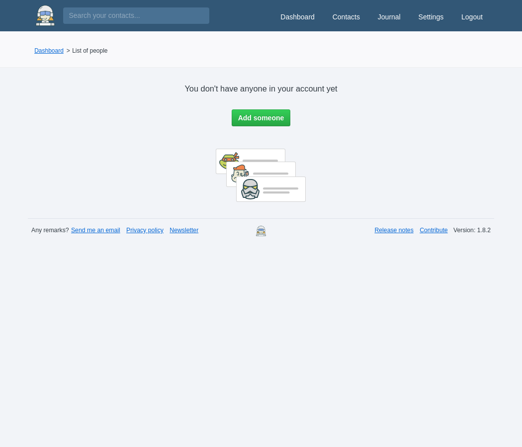 * Add translation for preferences updated successfully message (monicahq#797) * Add ability to export a contact as CSV (monicahq#840) * Fix contact field types not being linked to account during vcard import (monicahq#841) Fix monicahq#838 * Add more unit test coverage for money helper (monicahq#842) * Add more unit tests for Gift model (monicahq#843) * Add Code Coverage to Browser tests (monicahq#813) * Using Live-code-coverage to get Code Coverage from http server * Add a new test to pass Login form * Add FakeUserTableSeeder to seed in testing env * Using SESSION_DRIVER=file in travis env * Add saucelabs connection (disable right now) * Update composer * Move codecov line (monicahq#844) * Add more unit tests for User, Tag, Reminder and PetCategory models (monicahq#845) * Add final unit tests for DateHelper (monicahq#846) * Add more unit tests for Task, User and Tag models (monicahq#848) * 2FA tests cover (monicahq#849) * More unit tests for many models (monicahq#851) * Add margin bottom to add contact form (monicahq#850) * Do not put specific editor files in gitignore (monicahq#855) * Bump version to 1.6.2 (monicahq#856) * Some more 2fa test (monicahq#854) * Fix avatar being invalid in the Contact API call (monicahq#863) * Add Annual plan (monicahq#861) * Fix annual plans generating an error for users exempt of the paid plan (monicahq#864) * Fix a regression when filtering the list of contacts based on tags (monicahq#801) * Update laravel-mix to version 2.0.0 (monicahq#847) * Add requirements section in README (monicahq#858) * Revert Laravel mix to 1.7.2 (monicahq#866) * Remove env variable from prod (monicahq#867) * Fix jquery-tags-input name import (monicahq#859) * Set DB_PREFIX to a real empty string (monicahq#873) * Fix Gitter link and readd badge for sonar (monicahq#871) * Add gifts_update_success (monicahq#876) * Update changelog with recent changes (monicahq#877) * Test php 7.2 and postgresql (monicahq#785) Running: - php 7.1 + mysql + selenium (browser) tests - php 7.2 + mysql - php 7.1 + postgresql * Add support for custom genders (monicahq#879) * Refactor destroyAndReplace method to facilitate unit testing (monicahq#880) * Add missing features in README (monicahq#881) * Activate saucelabs connection (monicahq#882) * Activate saucelabs (missing file) (monicahq#883) See monicahq#882 * Build assets on travis and deploy them on bintray (monicahq#884) * Fix deploy.json creation (monicahq#888) * Fix docker image (monicahq#885) * Remove nodejs and 'npm install' from image * Remove everything that is not usefull * Run composer with no-dev * Don't build docker image immediatly (monicahq#889) * Don't build docker image immediatly * Fix php serve making too much output * Print test results in script part * Better edit contact screen (monicahq#890) * Remove import contact function from Personalization screen (monicahq#891) * Launch browser tests with Dusk (monicahq#892) * And remove old (steward) tests * Add ability to search contacts through the API (monicahq#895) * Add default avatar color in the API (monicahq#896) * Fix default genders seed with setup:production (monicahq#898) * Fix heroku deploy (monicahq#901) default login created after installation : '[email protected]' / 'admin' * Tiny typo fix (monicahq#900) * Update installation docs (monicahq#903) * Bump version to 1.7.0 (monicahq#908) * Fix setup:production command (monicahq#909) * Bump version to 1.7.1 (monicahq#910) * Run tests with php 7.0 (monicahq#904) * Update vagrant script and doc (monicahq#907) * Remove trailing slash from post/get requests (monicahq#912) * Cleanup continuous integration environment (monicahq#913) Move scripts in a subdirectory * Fix contact deletion not working (monicahq#915) * Improve travis build (monicahq#916) * Bump version 1.7.2 (monicahq#919) * Docker run real cron (monicahq#906) * Use crontab for schedules * Update apache conf file * Clean composer cache after installation * Clean apk cache after installation * Fix travis file for deploy stages (monicahq#926) * Fix bintray tag set (monicahq#927) * Fix Patreon link in README (monicahq#923) * Remove trailing slash from routes (monicahq#918) * Add ability to associate and remove one or more tags to a contact via the API (monicahq#924) 3 new API methods have been added: * It allows to associate one or more tags with a contact, * It allows to remove one or more tags from a contact, * It allows to remove all the tags from a contact at once. * Improve contact search through the API (monicahq#930) * Add sort capabilities in the API (monicahq#933) * Add concept of notifications for reminders (monicahq#894) * Add crowdin configuration file (monicahq#936) * Rename some i18n folders (monicahq#938) * Update french translations (monicahq#939) * Fix broken search (monicahq#941) * Fixes based on sonar recommandations (monicahq#934) * Bump version 1.8.0 (monicahq#942) * Fix bintray deploy (monicahq#943) * Support unix socket to connect with mysql (monicahq#928) * Remove saucelabs (monicahq#945) * Test if .git directory is present (monicahq#950) * Fix notifications not being sent (monicahq#951) * Fix reset account deleting default account values (monicahq#956) This fixes monicahq#922 * Remove partial contacts from search results returned by the API (monicahq#957) * Fix gravatar support (monicahq#944) * Fix messages and localization on contact edit (monicahq#955) * Bump version to 1.8.1 (monicahq#962) * Fix docker image creating wrong storage directories (monicahq#963) * Update translations for it, pt, cz, ru, fr, de, cs (monicahq#940) * Add bullet points to call lists when rendered from markdown (monicahq#961) * Create a vagrant box (monicahq#967) * Build vagrant box on travis (monicahq#968) * Switching doc to the wiki (monicahq#969) * Update SQL Import instructions link (monicahq#972) * Fix issues found by static analysis (monicahq#878) * sonar-launch file has moved (monicahq#974) * Optimizations for composer (monicahq#952) * Add apcu optimization * Update com