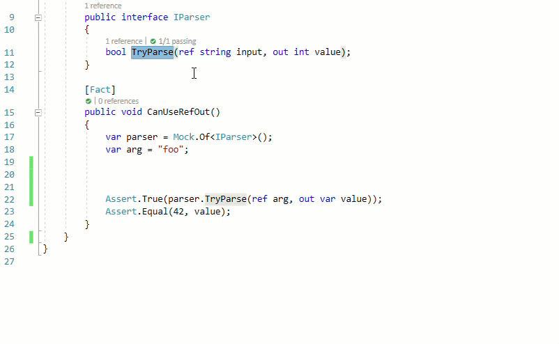 So rather than that, offer a built-in way to generate a delegate that can be used to directly set up and implement the method, with full typed arguments including ref/out annotations, just like you would if you implemented the interface manually (which you likely do when things get complicated because of this issue!).