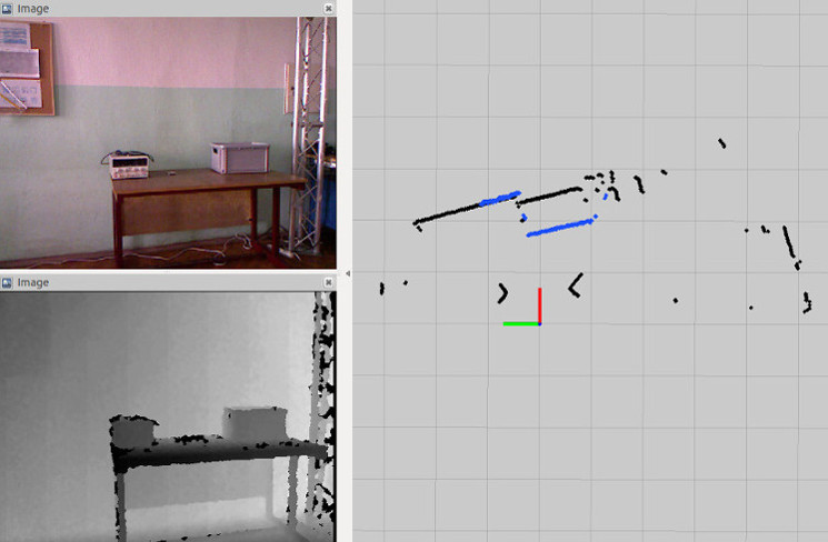 The picture shows comparison between a laser scan based on the converted depth image from a Microsoft Kinect (blue points) and a laser scan from a scanner Hokuyo URG-04LX-UG01 (black points).