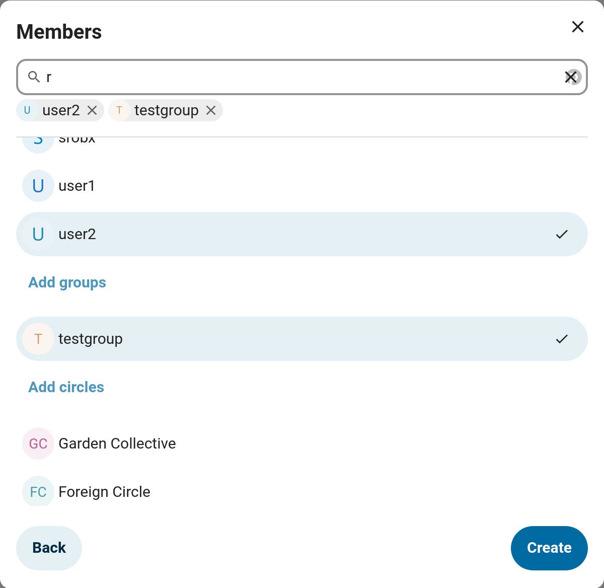 * Fix emoji button width to 44px * "Select member" => "Add people" * No default background for member search results * Align checkmarks for selected member search results to right * Fix invisible circle picker dropdown menu * Add min-height to selected members area to prevent content jumping * Clear search results before starting a new search Signed-off-by: Jonas <[email protected]>