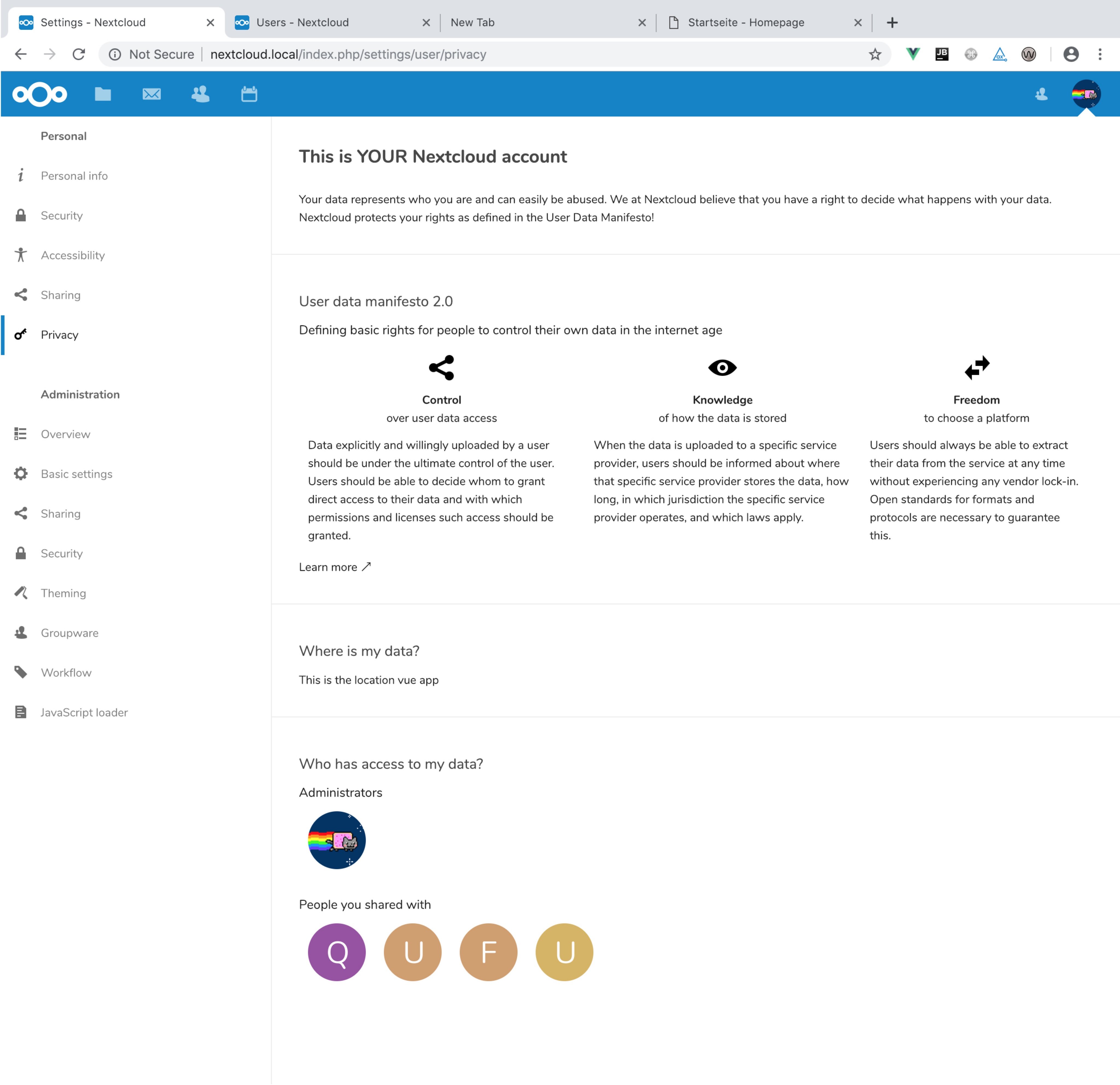 @georgehrke thanks for the info. So that will be the official "where is my data" app? That would mean this PR is obsolete? |