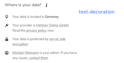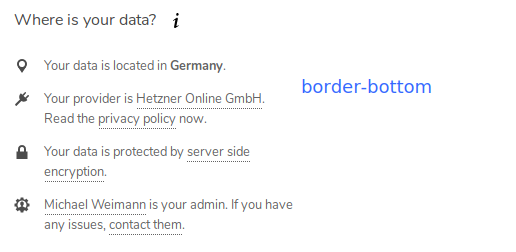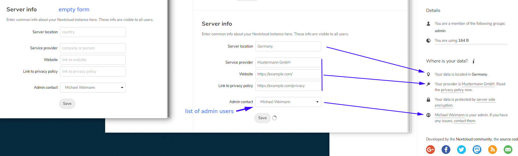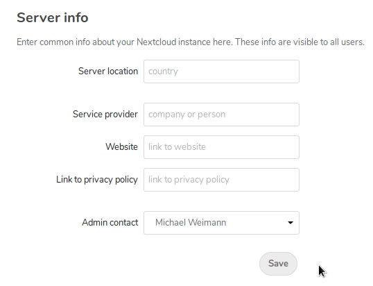 Not sure if this makes sense. Thinking about it though … Mastodon for example also shows the instance admin in more public places like the home page (and Discourse also has a page for it), and server location is something we could even show in the footer (just an idea, probably too much info) so it would indeed be more related to general theming. @juliushaertl what do you think? Let’s just make sure that we do it step by step. And the first step is to just not duplicate info we already have in theming. :) |