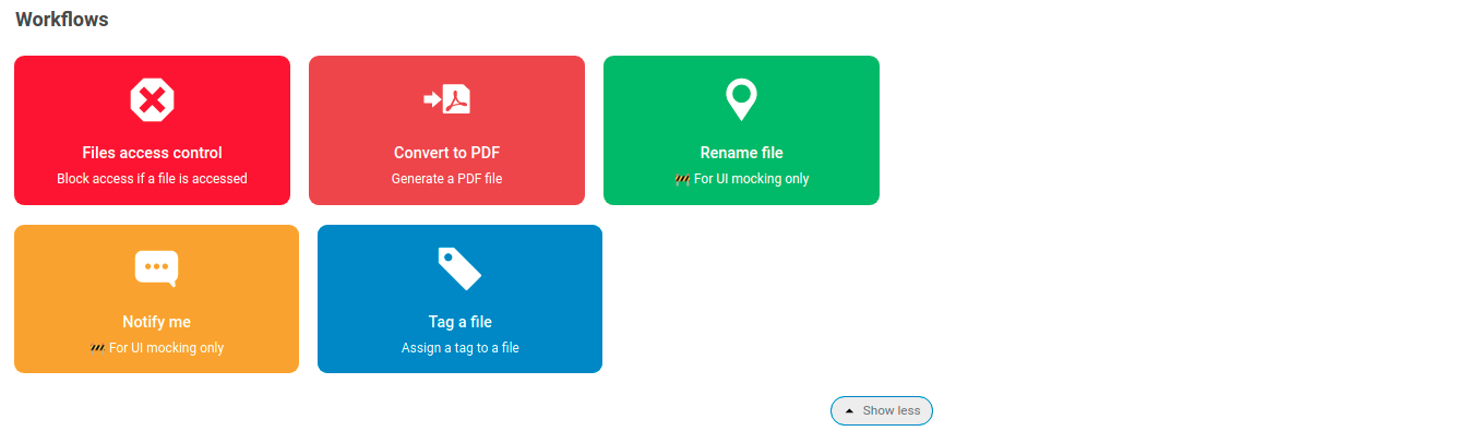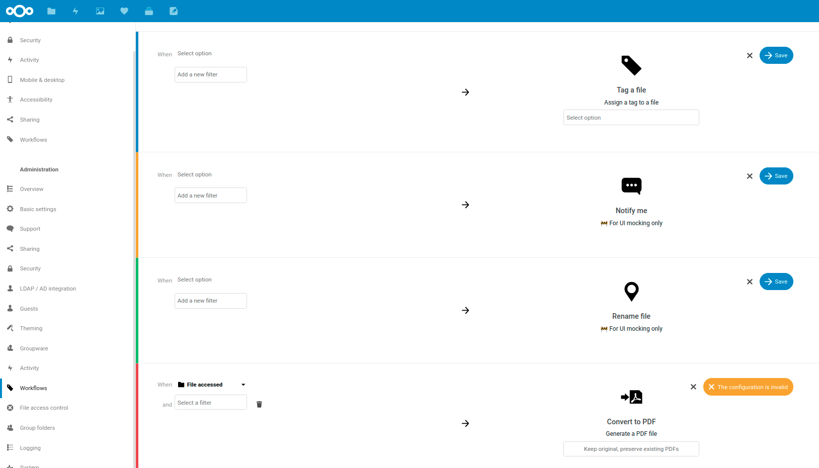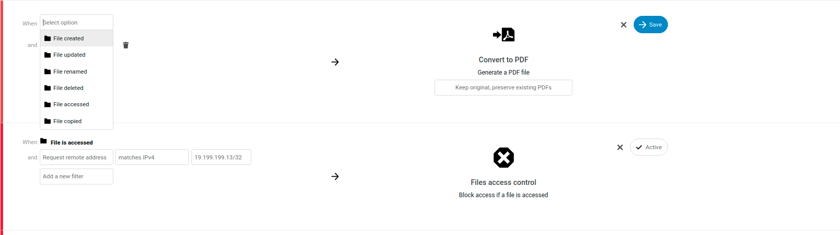 Looking at the screenshots and using the app again, it seems that there’s a loooot of horizontal whitespace we can’t really do much about with a list-type layout. It’s all a bit floating in the air. It seems that vertical boxes for the actions would fit better, as we thought about for mobile @juliushaertl? It would have the maximum width of the 3 inputs which are in the "When" condition.