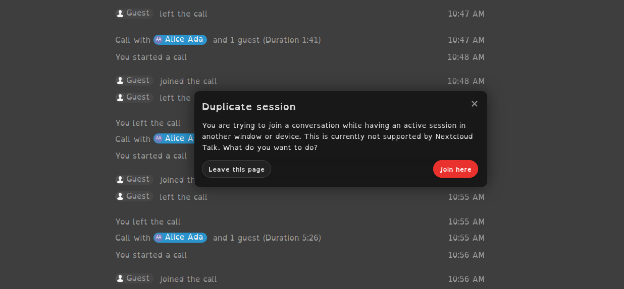 - Open the same conversation in another tab and choose Join here: the previous tab just stays in the conversation (although in the browser console it can be seen that is connected and disconnected from the external signaling server again and again).