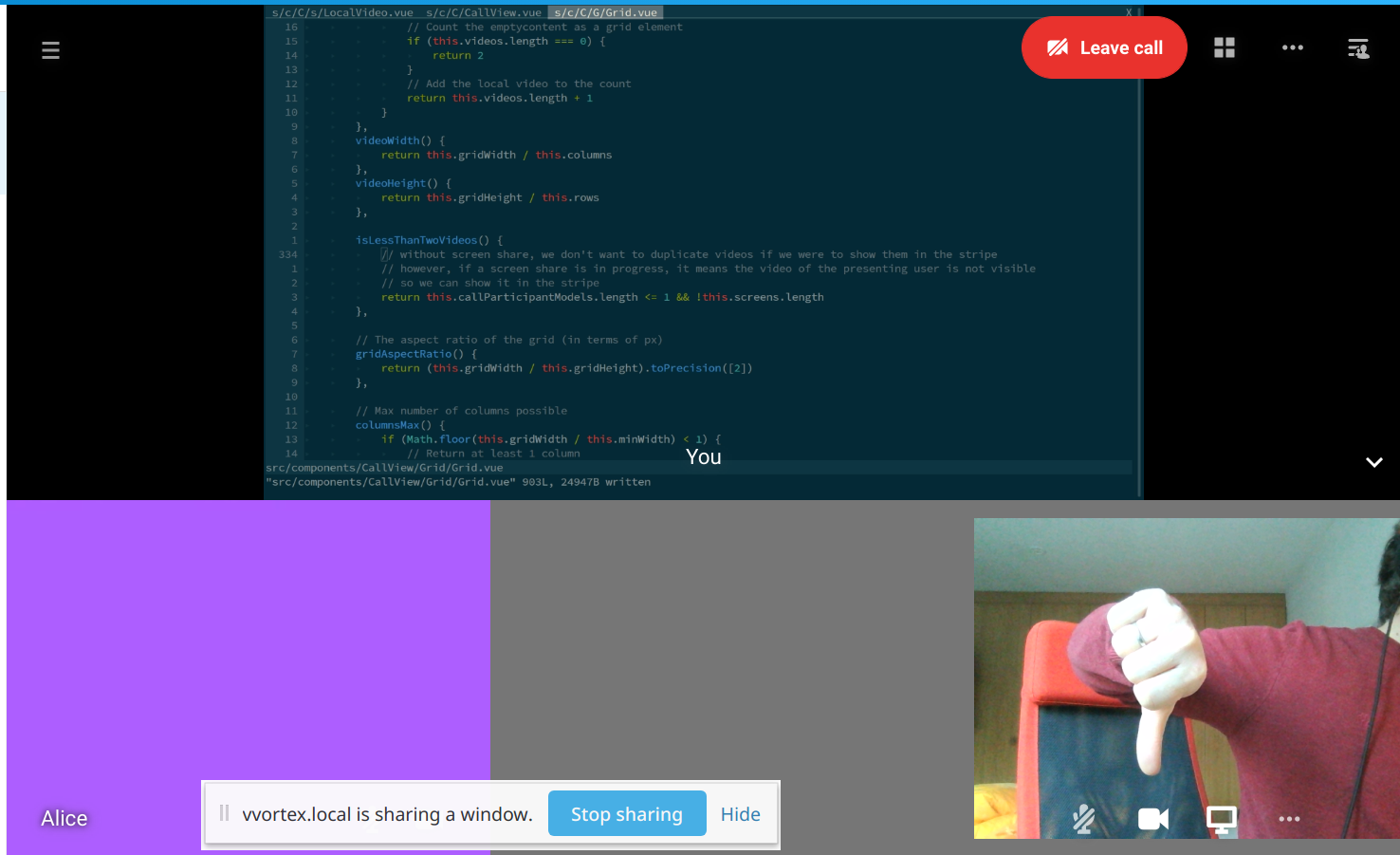 Right side is the user receiving the screen share (alice). The video of "admin" is visible also in the stripe.