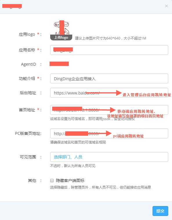 五、在企业OA后台【企业应用-应用管理】里面创建微应用,并把工程的首页地址(例如:http://xx.xx.xx.x/index.html)填到微应用首页中并保存。[如何创建微应用?](https://open-doc.dingtalk.com/docs/doc.htm?spm=a219a.7629140.0.0.hlq1Vw&treeId=367&articleId=104938&docType=1)。 该demo只能在移动端才会有效果。(注意:移动端点击应用跳转,如果无法访问你填写的首页地址,请确保你服务端与手机端的网络在同一个网段)