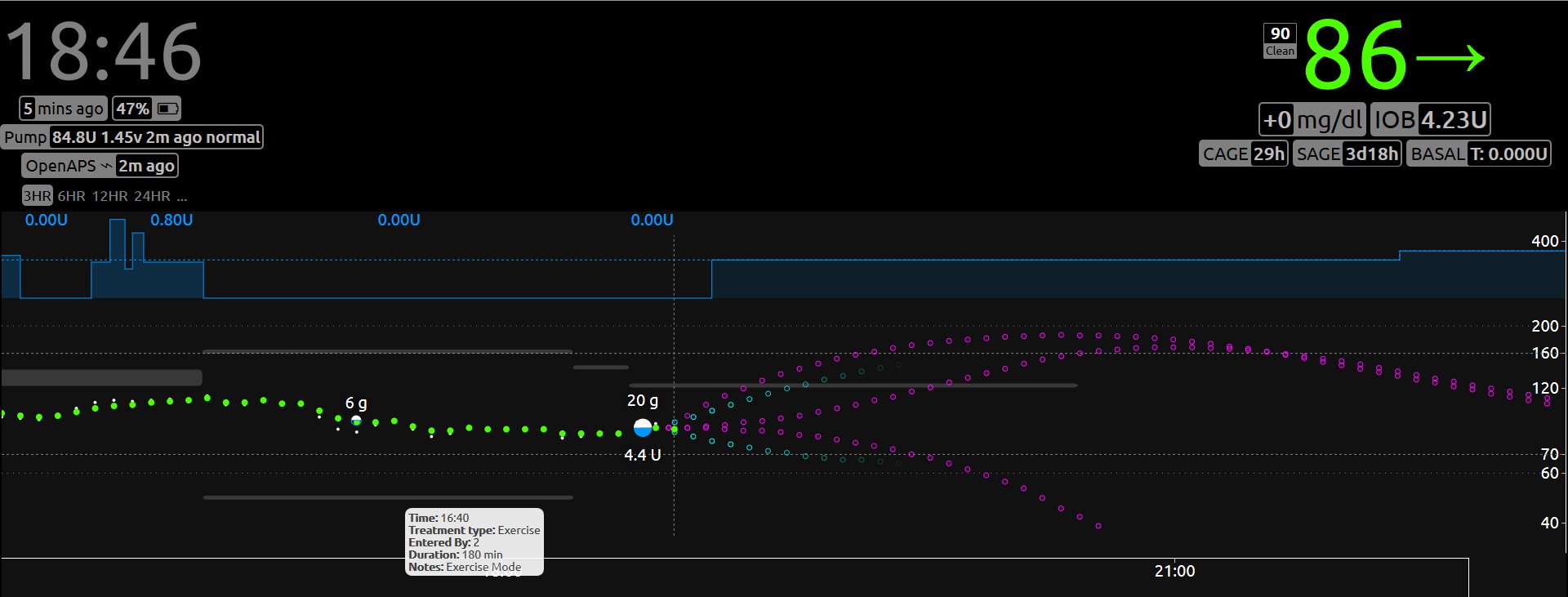 We just went on a tiny hike for science ;) Exercise mode did very well and the behaviour was much closer to what we would have done manually. IOB at the beginning was 0.5u with Fiasp/ultra-rapid curve/DIA=6h. The recalculation of IOB (0.5u->2.9u) , which led to long low temping, proved very useful. In my opinion the relation between temporary target and sensitivity ratio ( Achieving the same in exercise mode with the current constant of 40 in the formula requires us to set a temp target of 180 for moderate hikes. At least for us a constant of 20 or 25 feels much closer to what we do manually. Also only such constants make it possible to calculate sensitivity ratios of ca. 0.3 which we find typical for more intense exercise. Does oref0 provide a protection against endless low temping? Otherwise extensive low temping in exercise mode might lead to ketoacidosis. |