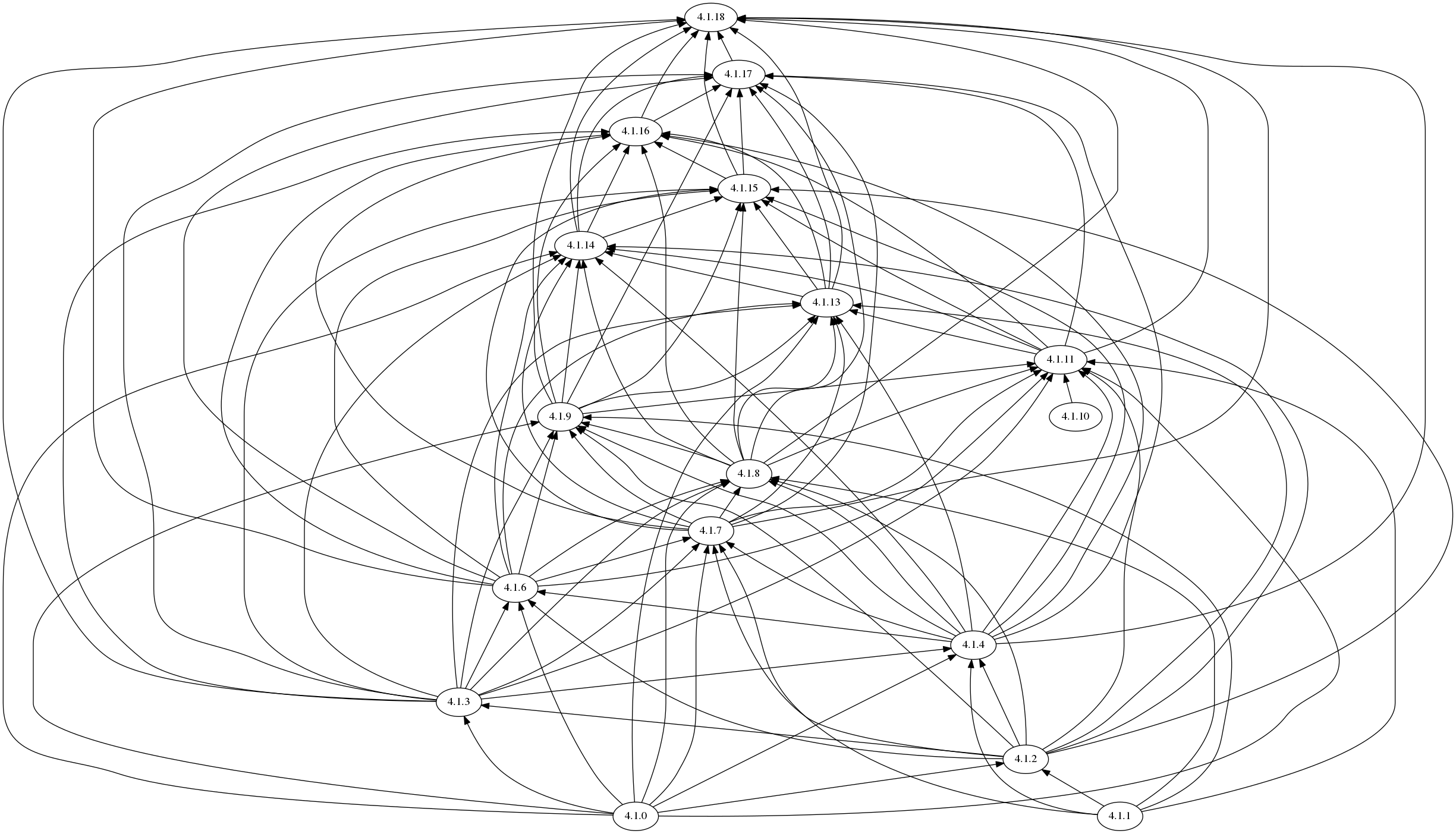 $ curl -sH 'Accept:application/json' 'https://api.openshift.com/api/upgrades_info/v1/graph?channel=stable-4.1' | ~/src/openshift/cincinnati/hack/graph.sh | dot -Tpng >graph.pngusing graph.sh to generate: