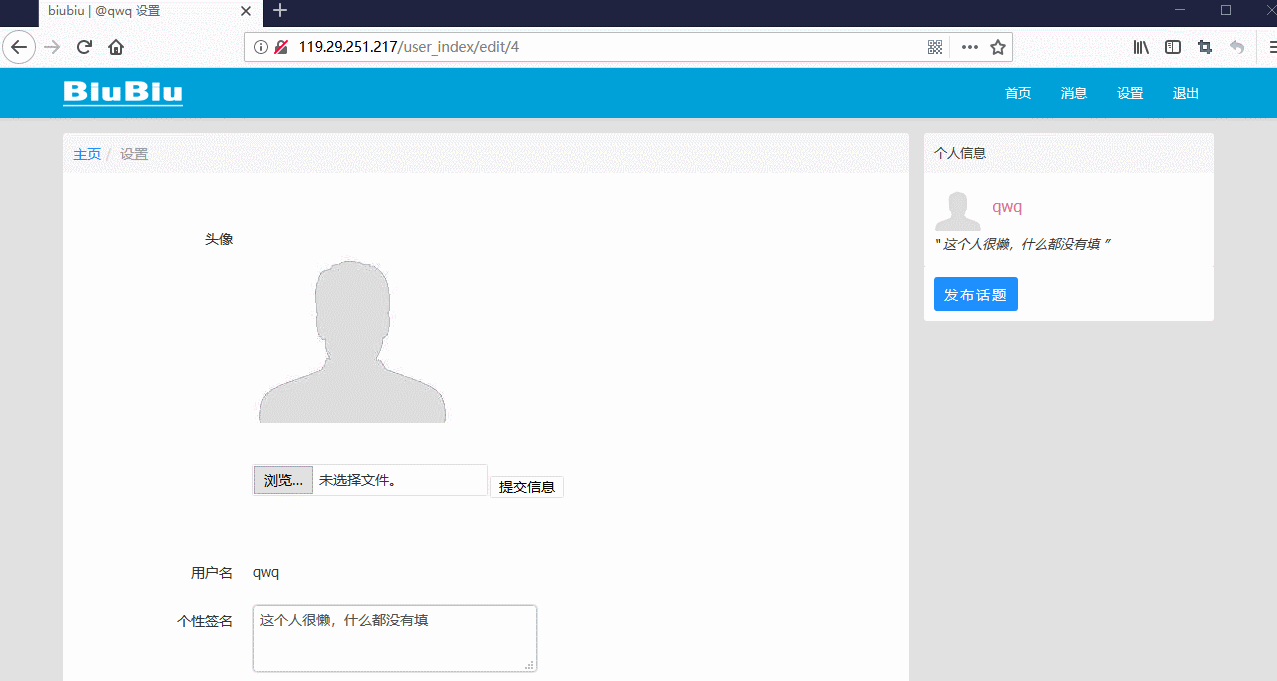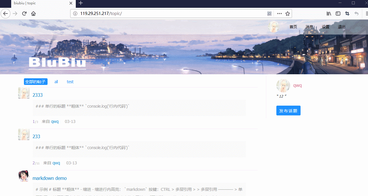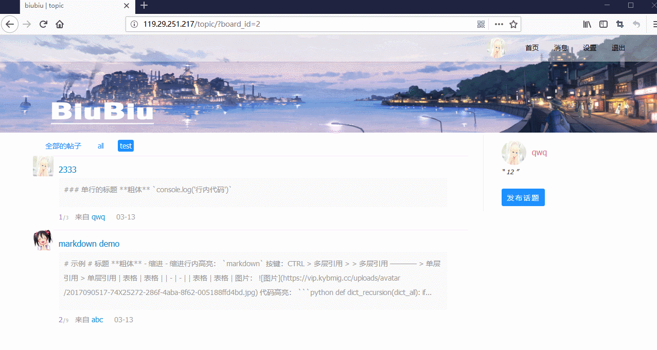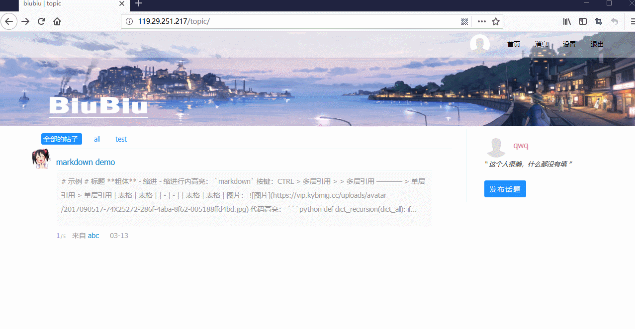 个人论坛 可使用该已有账号登录 账号:abc 密码:123 注册/登录 设有权限,账号密码长度不小于三且账号不重复 文章分区 创建话题 支持markdown格式 评论/点赞/@功能 已赞的文章再次点击取消点赞 消息通知 收到的评论/@/点赞会在消息中心通知 个人设置 用户可以设置自己的头像/签名/密码 用户介绍页面 这个页面会展示用户的近期动态