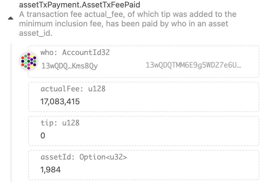 Example screenshot of a transaction on Statemint paying the fees in the asset ID 1984 but emitting the AssetTxFeePaid event in DOT balances: