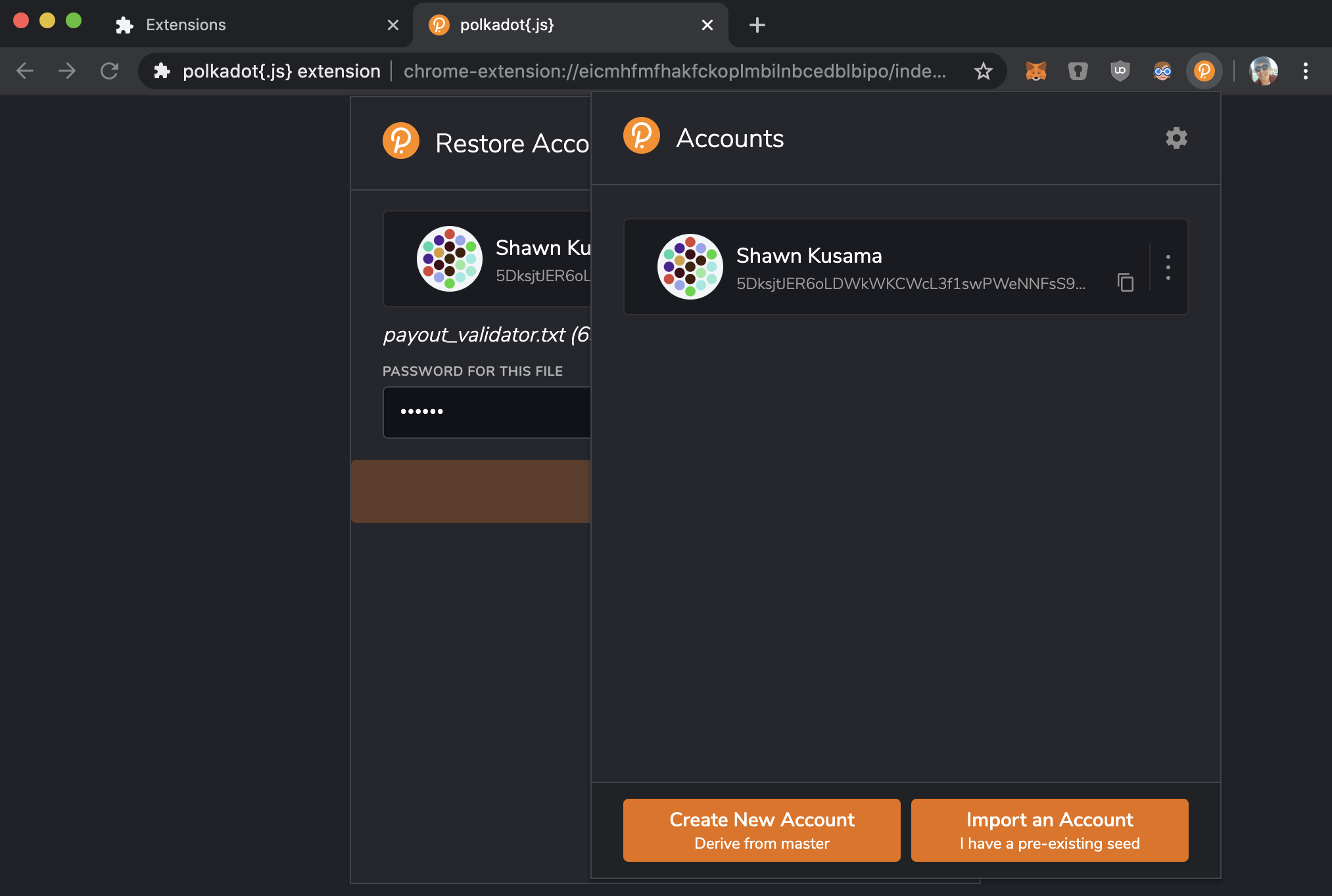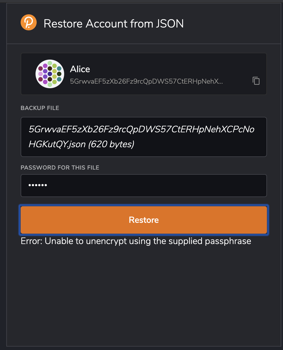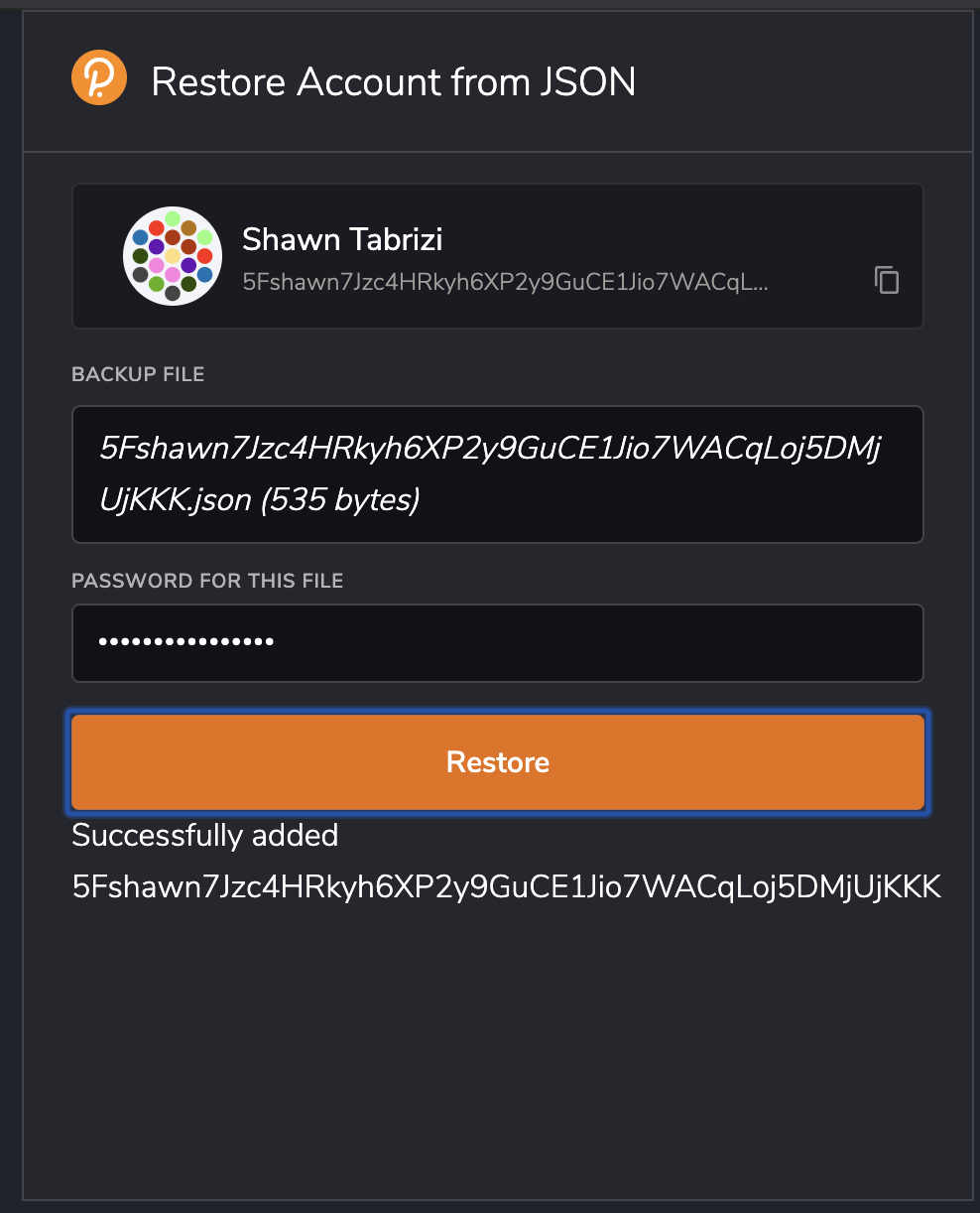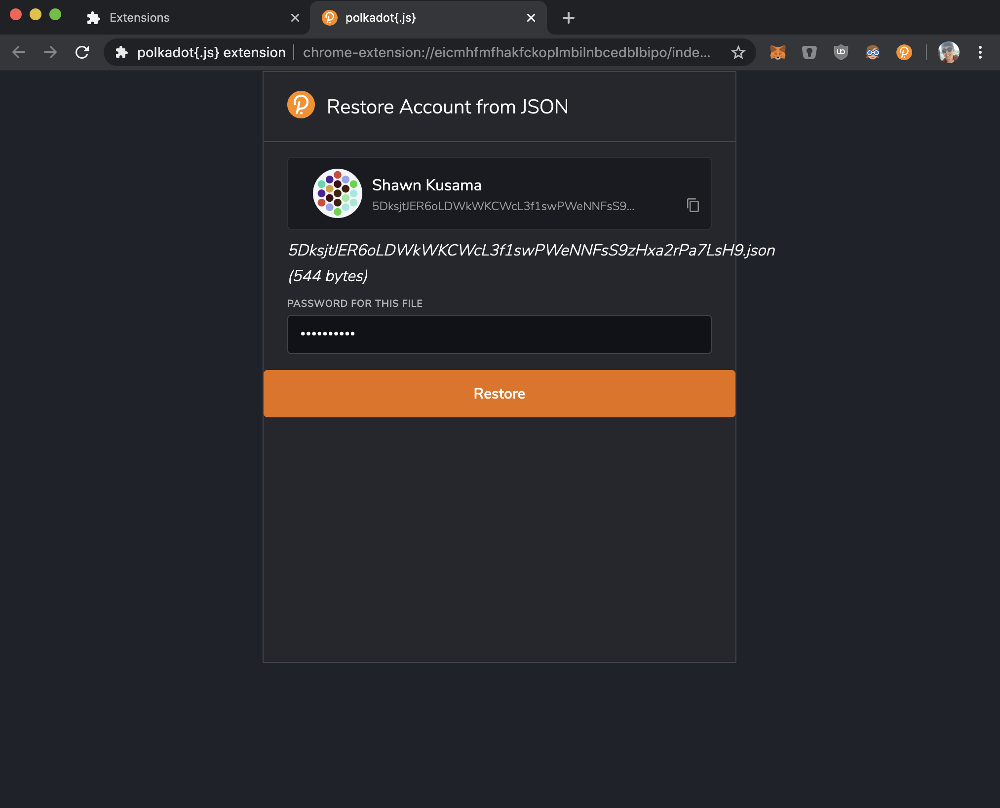 This is an early draft of enabling the Polkadot.JS extension to restore accounts using the JSON backup created by the Polkadot JS Apps.