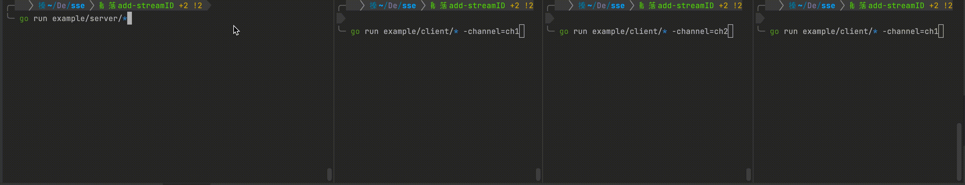 example client (we put client name into query parameter) channelPtr := flag.String("channel", "test", "channel id")