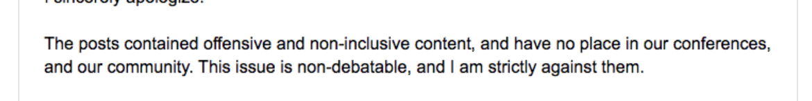 I’d like to emphasize that the Conferences and Meetups list on the React website is, and has always been moderated. We reserve the right to choose which events to put in the spotlight on our website. When we can’t in good conscience be confident that an event meets the standards that other React events live up to, we may choose to stop listing it. We may later choose to put it on the list again if we have a good understanding that the organizers are serious about fostering an inclusive atmosphere at their events. You are welcome to create your own list of conferences if you disagree with our editorial decisions. |