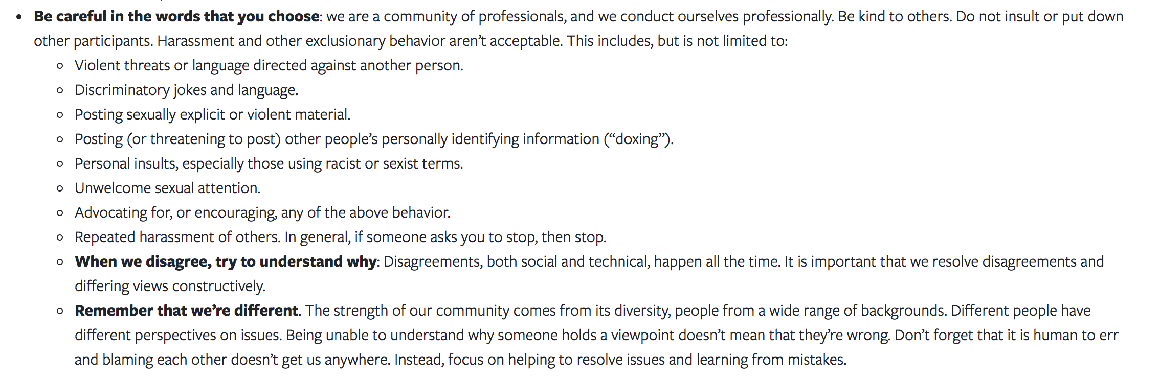 @gaearon Treating sarcastic satire as "trolling" (because this term makes its author looks offensive) is the same double standard, as removing for "Violation of CoC" while the true reason is "we don't like organizer, so GTFO, this is our list and we do what we want". (btw, this motivation is completely normal and I think everyone is ok with this) Anyway, thanks for your answer. It's much more clear now. There are a lot of people puts a lot of effort organizing conferences, communities and meetups. Sending them a signal "don't be an asshole" is a good thing, but it requires a little bit more transparency, like you just did. Blaming one of organizers for violation of rules, which was not in fact violated, leads to demotivation and frustration for others. But this is easy way and I glad you choose another. |