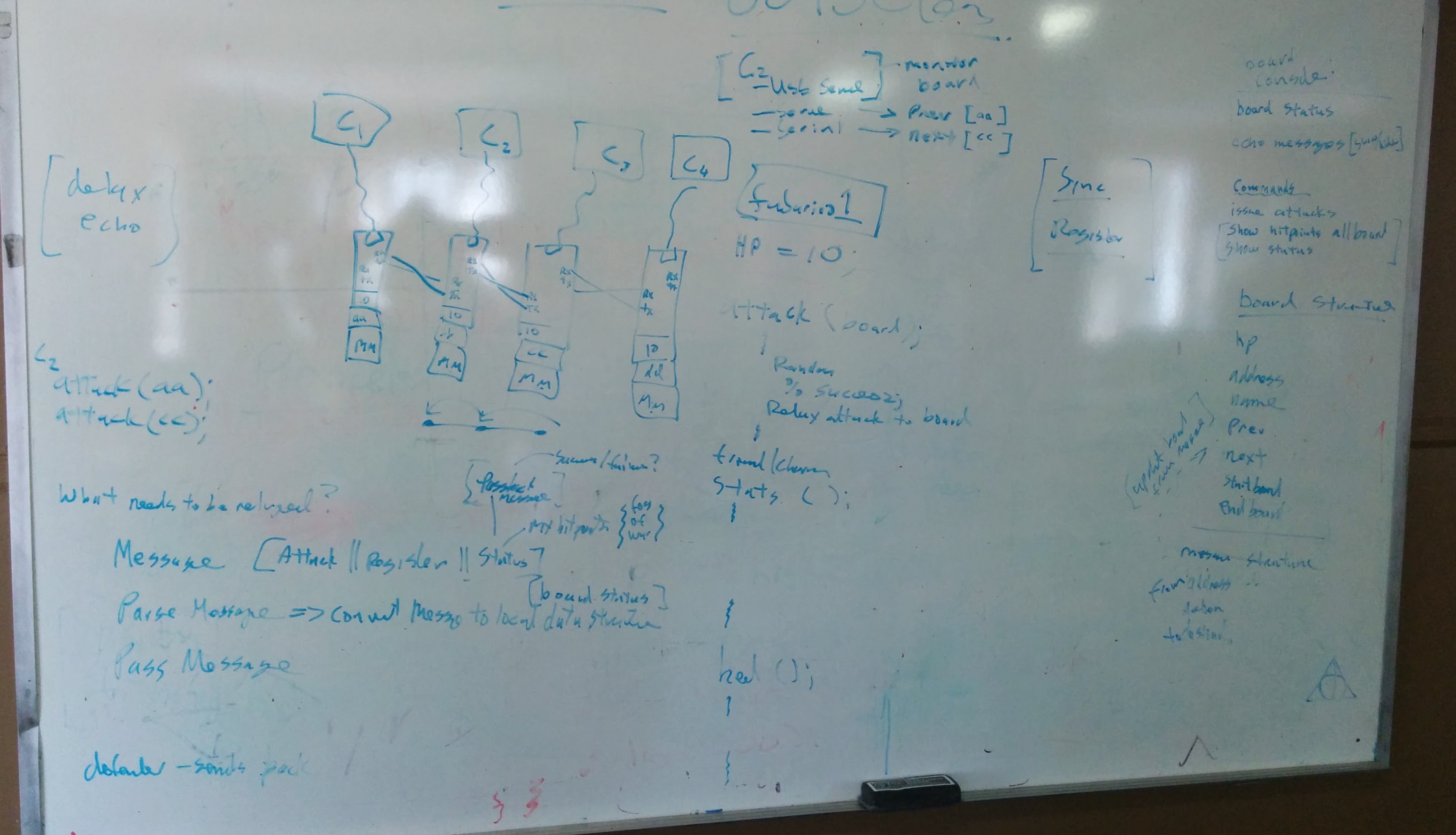 Arduino Serial combat We will connect N number of Arduinos that have more than three hardware serial ports together. Each Arduino will have hit points and a name. Attacks will have a psuedo random chance of succes. All linked Arduinos will pass messages to each other. These messages will list who is still alive. Attaks have to be declared by typing into the serial terminal the name of Arduino they are attacking. The message passing will continue until one last Arduino is standing.