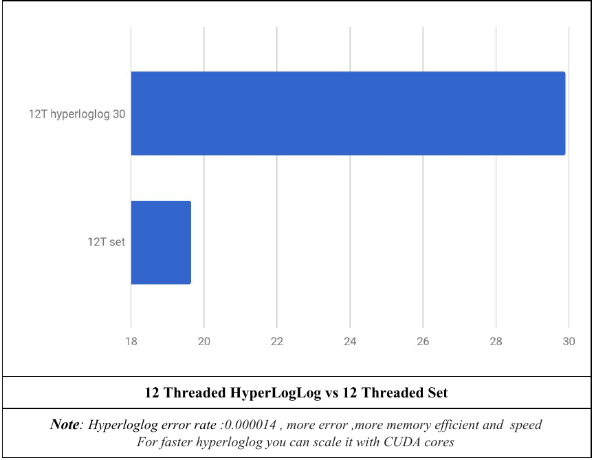 This is an algorithm for the counting distinct or unique objects using approximation ,it aproximatie the number of distinct elements in a set . Calculating the exact cardinality (number of distinct elements) of a multiset requires an amount of memory proportional to the cardinality, it uses significantly less memory than hash table or set ,its able to estimate cardinalities of > 109 with a typical accuracy of 2%, using 1.5 kB of memory.[1] More improvements you can Scale Hyperloglog using CUDA.