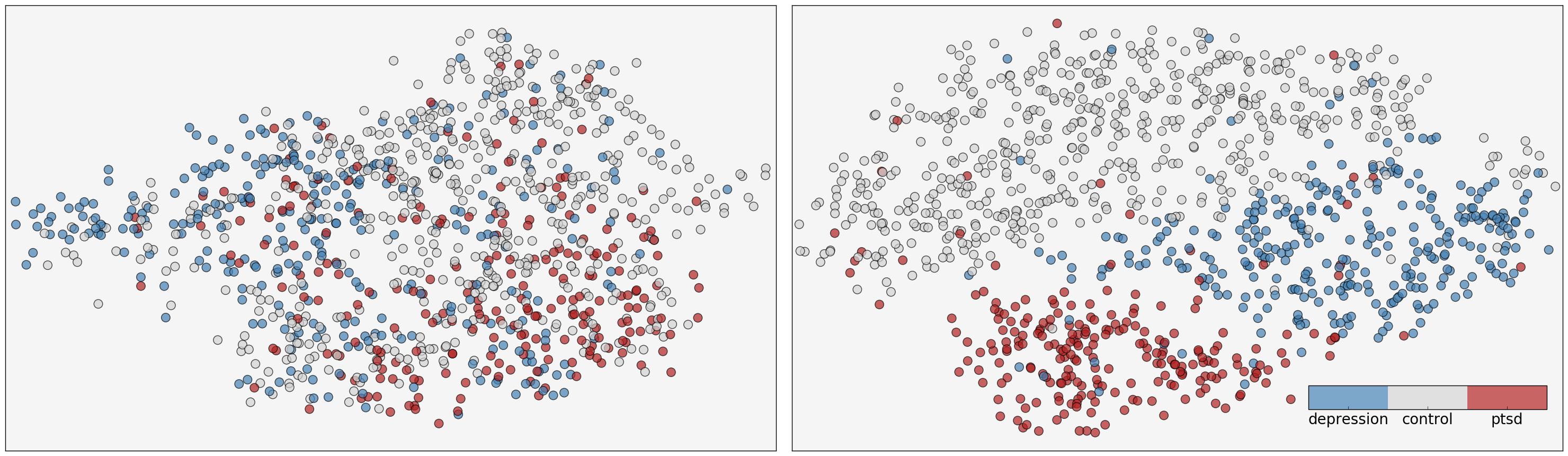 Figure 1 - User embeddings projected into 2-Dimensions and colored according to mental health status.