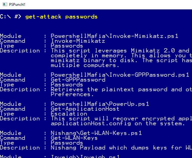 PS>Attack contains over 100 commands for Privilege Escalation, Recon and Data Exfilitration. It does this by including the following modules and commands: