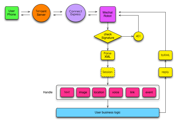 诸多细节由wechat中间件提供,用户只要关注蓝色部分的业务逻辑即可。