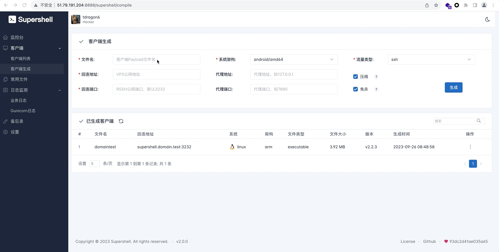 Supershell是一个集成了reverse_ssh服务的WEB管理平台,使用docker一键部署(快速构建),支持团队协作进行C2远程控制,通过在目标主机上建立反向SSH隧道,获取真正的完全交互式Shell,同时支持多平台架构的客户端Payload,客户端Payload的大小为几MB,可以理解为在目标主机上部署了一个几MB的ssh服务器,然后获取了一个ssh shell;Supershell集成了客户端管理、客户端Payload生成、交互式Shell、文件管理、文件服务器、内存注入、安装服务、迁移guid、本地原生sftp命令传输文件、本地ssh隧道端口转发和备忘录等功能。