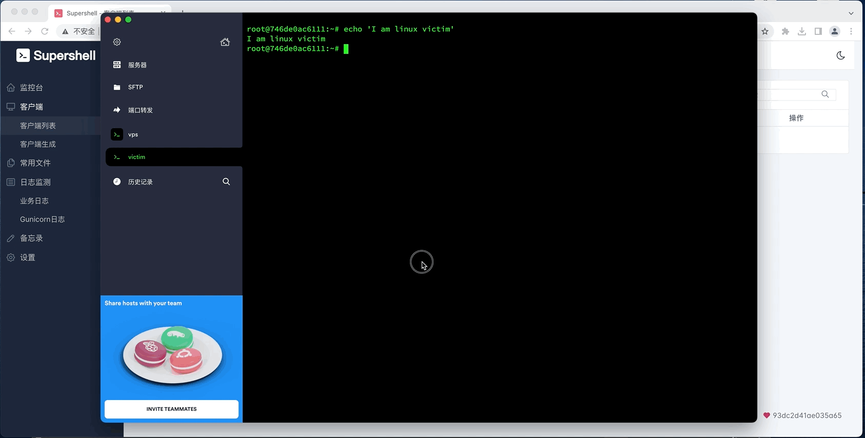 同时Supershell允许您将获取到的Shell分享给您的伙伴使用,Shell均通过浏览器页面嵌入,共享Shell采用单独的鉴权方式,无需给您的伙伴提供管理平台的身份认证凭证。
