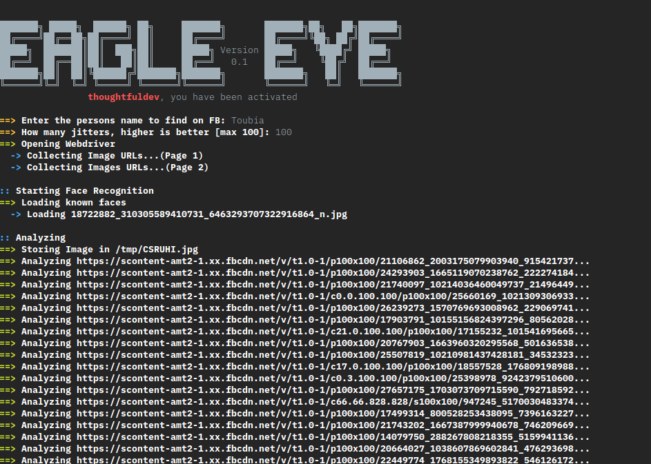 You give EagleEye a name and at least one photo. It searches this name in Facebook and performs Facial Recognition to find the right Facebook Profile. Afterwards it uses Google and ImageRaider Reverse Image Search to find other Social Media Profiles.