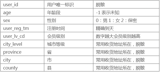 - 用户基础特征:用户注册年份,用户注册天数,年龄,性别,用户等级,城市等级,用户的地点(省份,城市,城镇)