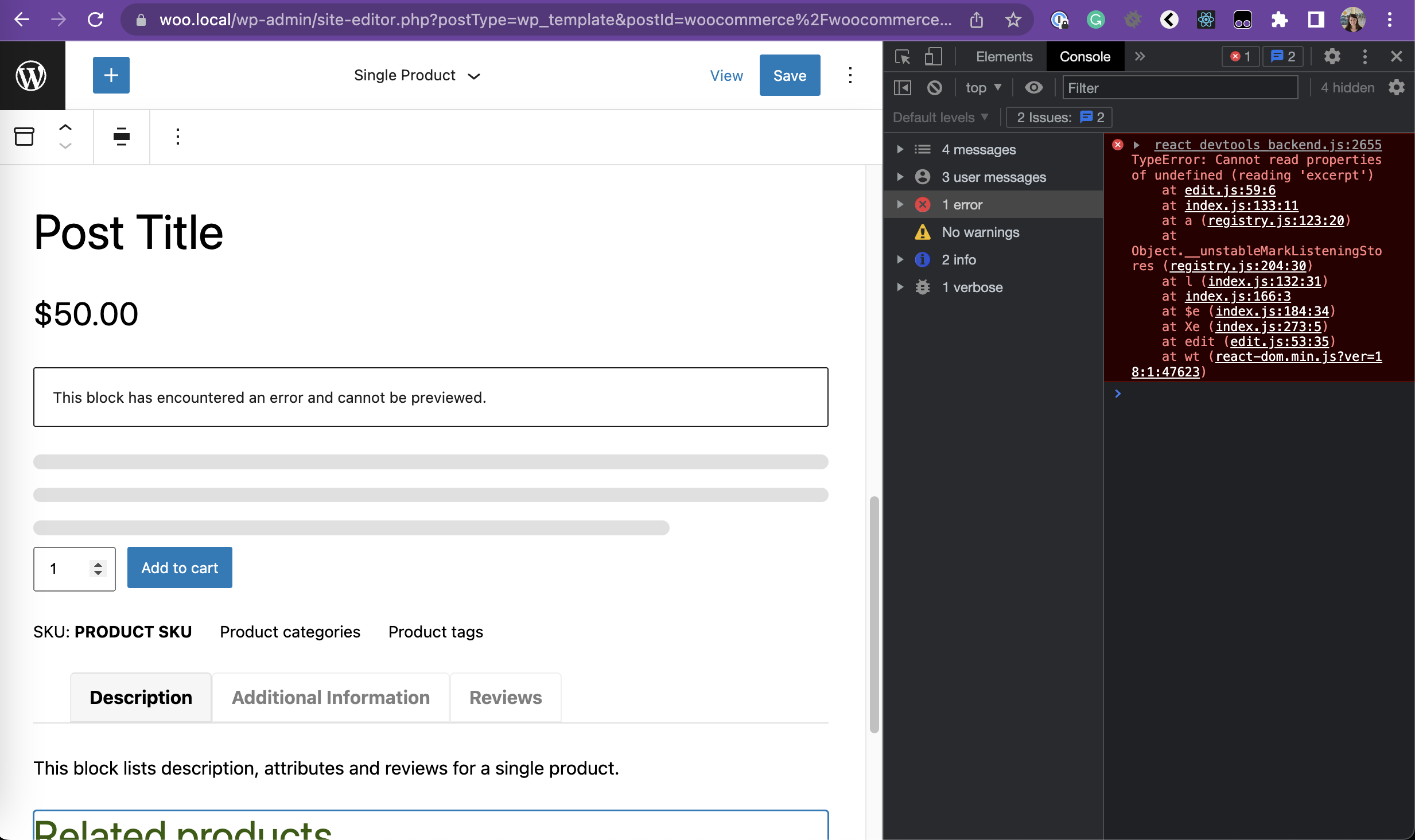 Thanks for addressing all feedback! I did another round of tests; there's only one problem that surfaced that I would recommend fixing before merging, as it is a regression when using the post excerpt block outside of the single product block. The following example is when adding this block to the single product template. On the editor, the following error is triggered: