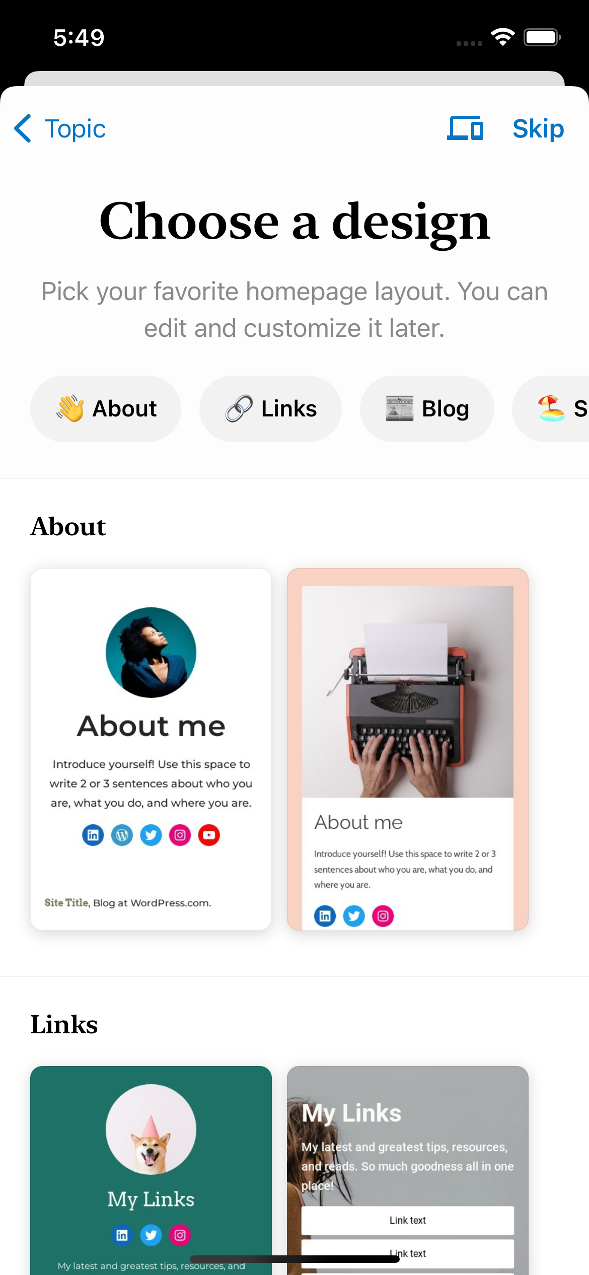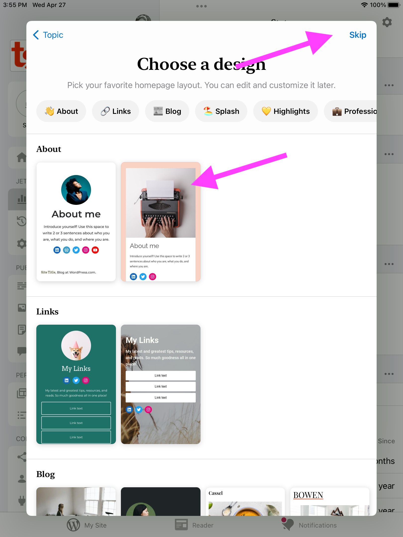 enhanced_site_creation_site_design_viewedto be fired withpreview_modeset tomobileenhanced_site_creation_site_design_preview_viewedto be fired withpreview_modeset tomobileandtemplateset to the corresponding designenhanced_site_creation_site_design_preview_loadingto be fired withpreview_modeset tomobileandtemplateset to the corresponding designenhanced_site_creation_site_design_preview_loadedto be fired withpreview_modeset tomobileandtemplateset to the corresponding designenhanced_site_creation_site_design_preview_mode_button_tappedto be fired withpreview_modeset tomobileenhanced_site_creation_site_design_preview_mode_changedto be fired withpreview_modeset totabletenhanced_site_creation_site_design_preview_loadingto be fired withpreview_modeset totabletandtemplateset to the corresponding designenhanced_site_creation_site_design_preview_loadedto be fired withpreview_modeset totabletandtemplateset to the corresponding designenhanced_site_creation_site_design_selectedto be fired withtemplateset to the corresponding designTracks events - iPad