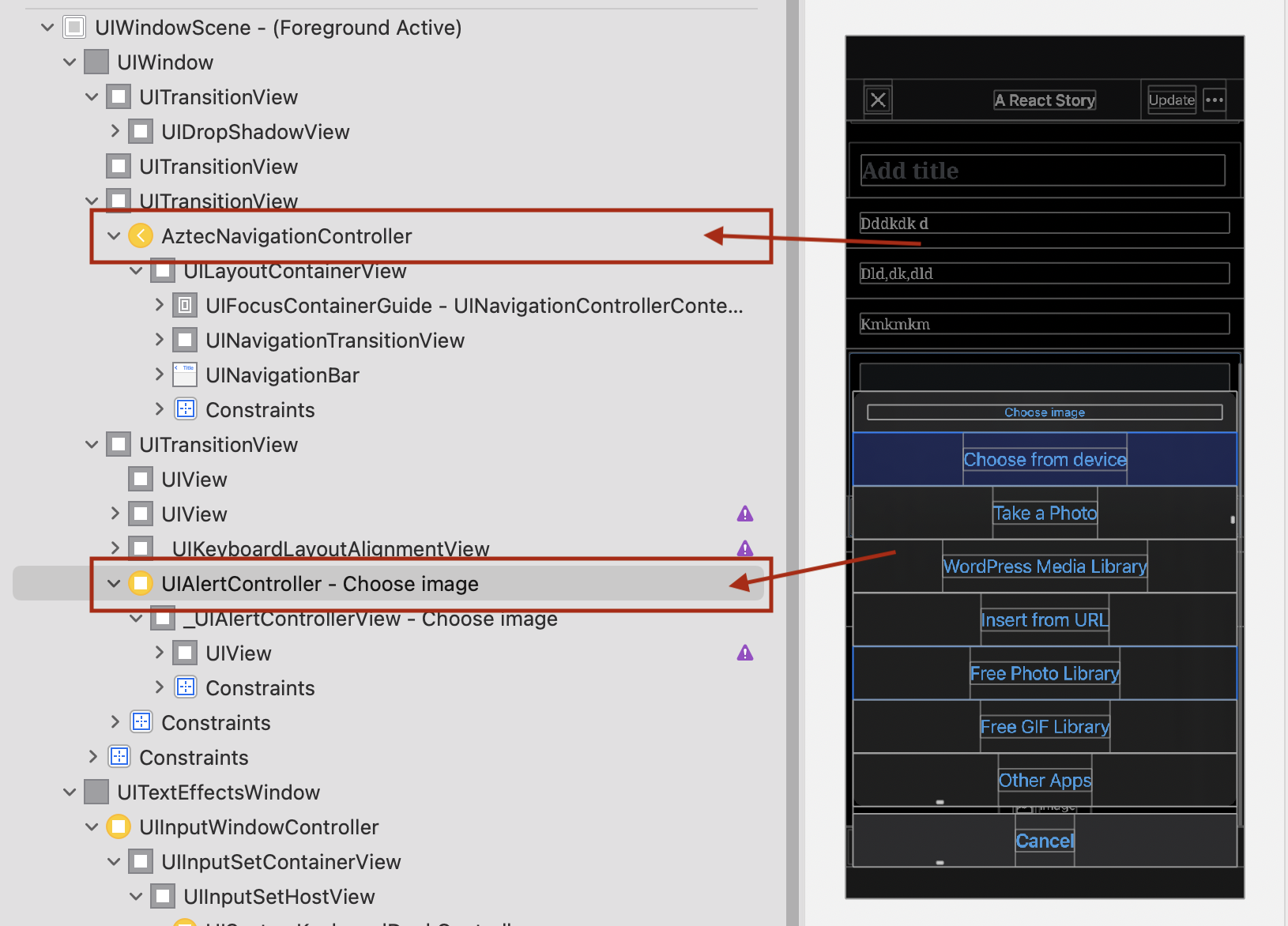 I checked the hierarchy and I believe that AztecNavigationController is a 'sibling' view to UIAlertController, rather than a parent view