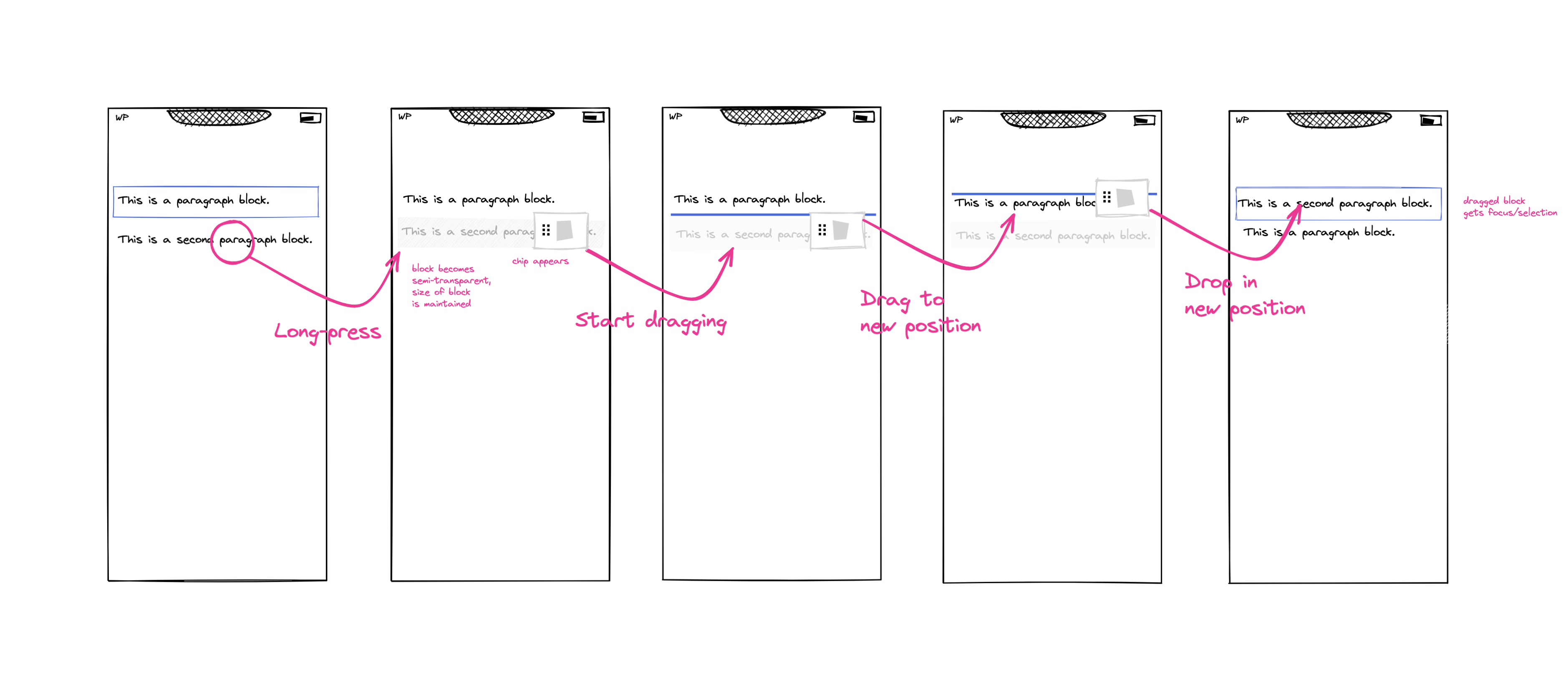 Hey @fluiddot great work thus far! I took this for a spin via the iOS and Android builds separately and jotted down some notes, some of which is platform-specific but mostly related to the behavior and sequencing of the interaction. I may have some additional visual design-level feedback in the next round, but I wanted to focus on the core interactions first. Collapse behavior/sequencingInstead of collapsing the block immediately upon long-press, can we wait to collapse it until the "chip" is dropped in a new location? This would essentially "hold" the space of the original block when dragging and ensure that blocks don't move around as much. The sequence would be something like this:
