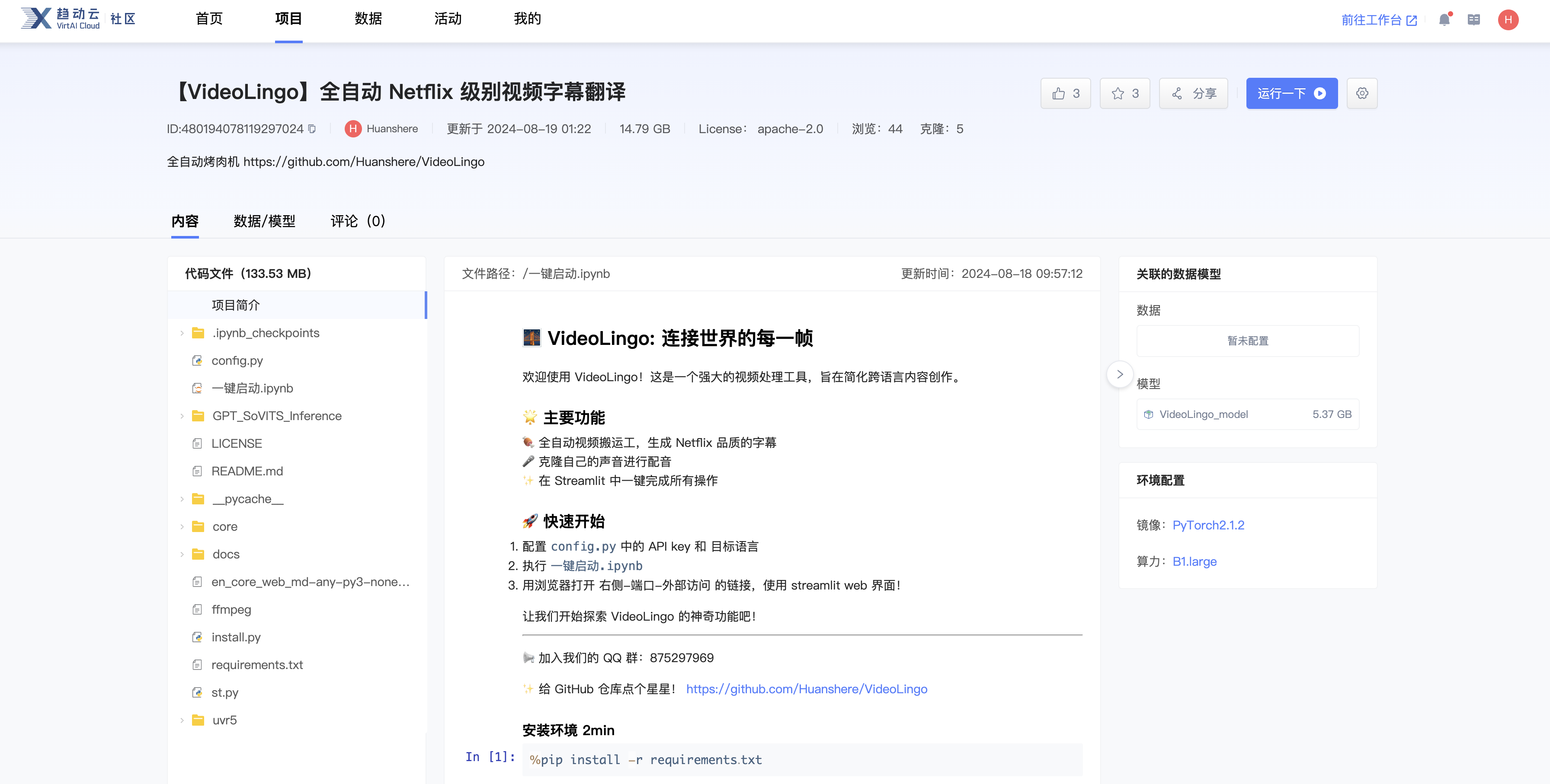 - 本项目已部署在 趋动云-VideoLingo,新注册用户赠送等额 35h 免费使用,具体教程 点击这里