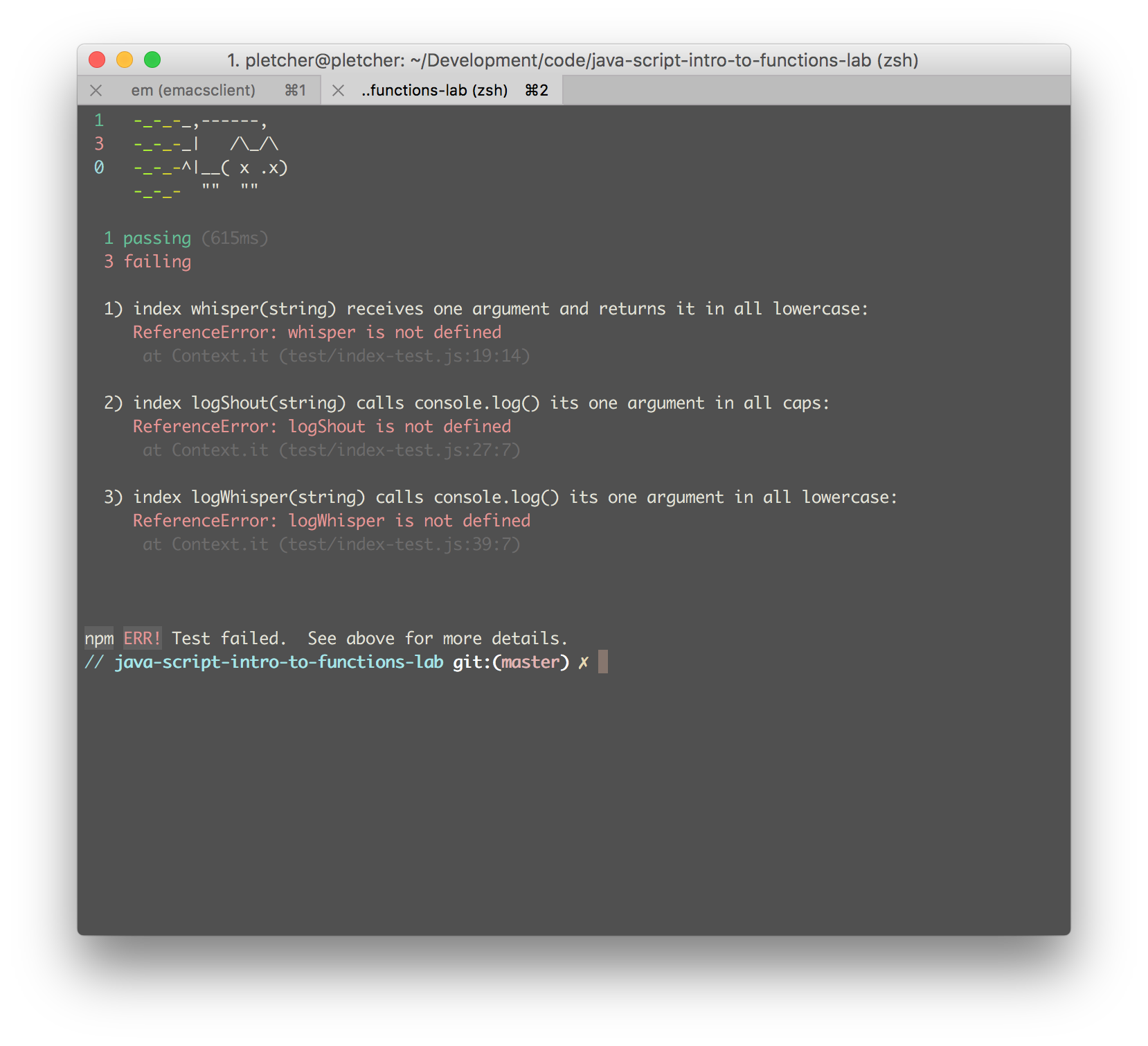 Hm, that's kind of disappointing. Let's see if we can get that first test to pass. Open up index.js