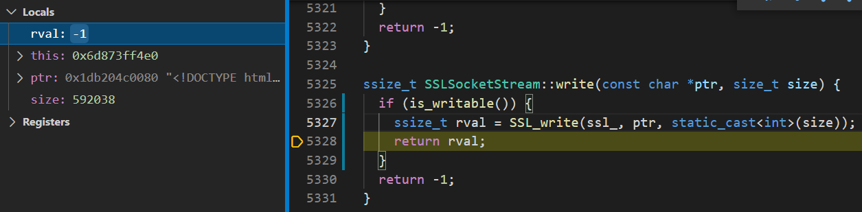 This results in an SSL_ERROR_SYSCALL error from SSL_get_error(rval);