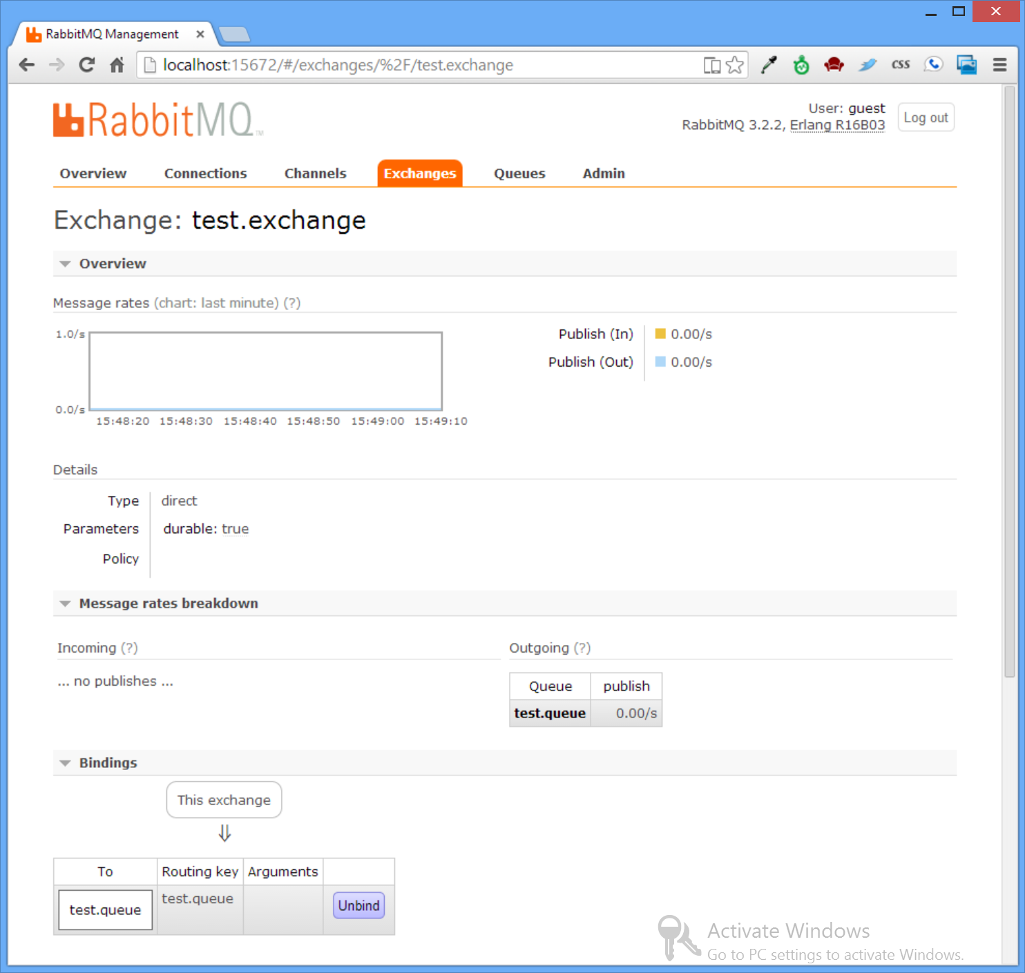 The registration code only needs to be run once to register and configure the Exchange and Queue we'll be using in the remaining examples. Once run, go back to the Management UI to see the new test.exchange Exchange with a binding to the newly created test.queue: