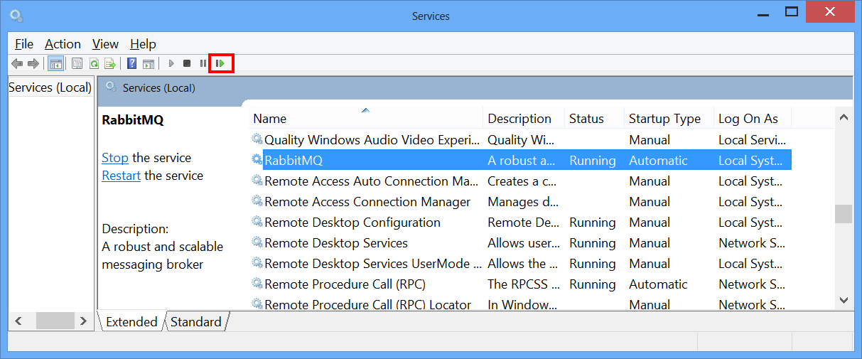 - Select the RabbitMQ Windows Service and click the Restart Icon: